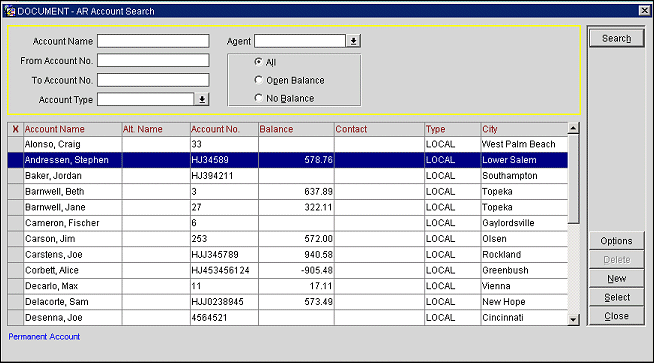 To delete all no-balance accounts of a specific account type, or all no-balance accounts having account numbers in a specific range, use the AR Account Search screen search criteria to filter the accounts.