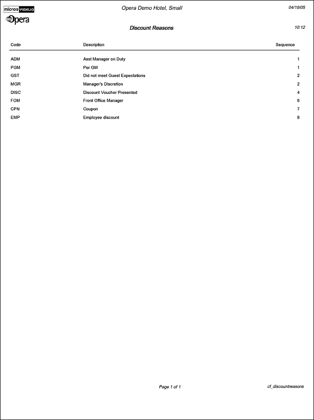 The Configuration report for Discount Reasons will display all Discount Reasons that have been configured. When either a discount amount or percentage is given on a reservation, the user must select a discount reason of why this discount was given.