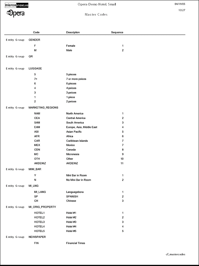The Configuration report for Master Codes will display all Master Codes that have been configured in the application. Master codes are found throughout the configuration application and can also be created manually by the property. If the license code for multi property functionality is activated (OPP_MHOT), this report will represent all codes on the template form.