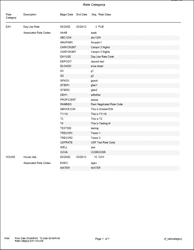 From Date/To Date. This report identifies rate categories (and associated rate codes) that are valid at least one day within a particular date range. Enter a From Date and a To Date to define the date range. The default From Date is the current business date and the default To Date is blank (null), meaning that any rate category that is valid today or any date in the future will be listed on the report.