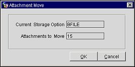 The information on this screen cannot be and does not require any modification. This screen simply confirms your choice as well as the number of attachment files to be moved. Since there are only two options to choose from, BLOB and BFILE, the Attachment Move utility will automatically select the attachment storage type not currently in use. Click OK proceed.