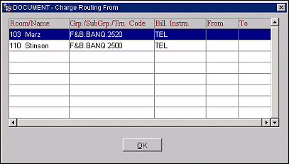 Use the Charge Routing From screen to view the guests from whom charges are being routed to the current guest. This screen appears when you select the From button from the Setup Routing Code screen. (The From button is only available if transactions are being routed to the current guest's Billing screen from other rooms.)