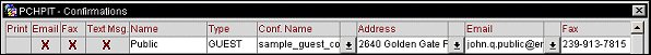 The primary fax and primary email addresses are automatically displayed on the Confirmations screen for sending confirmation/reservation update/cancellation letters. For added convenience, OPERA offers a further option. When you select a fax or an email address as the Primary, the Default Communication Method check box appears (see below). Use this option to indicate that the address should be pre-selected for sending confirmation letters to this profile. A sample Confirmation screen is shown below. The Fax address and Email address shown for the guest have both been designated as the Primary addresses for these roles on their respective Communication Information screens (although there may be other addresses having the same communication roles). In addition, the Default Communication Method check box on the Communication Information screens for these addresses has been selected. We know this because there is an X, by default, in the Email and Fax fields to the left of the guest's name when we open the Confirmations screen.  (These choices can be un-selected if you decide not to send the email and/or fax confirmations to the guest.)