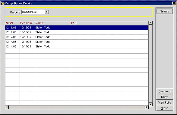 Note: If you access the Comp Bucket Details screen from an account, group, or source profile, the screen shows comp revenue attributable to guests whose reservations were attached to the current account, group, or source.