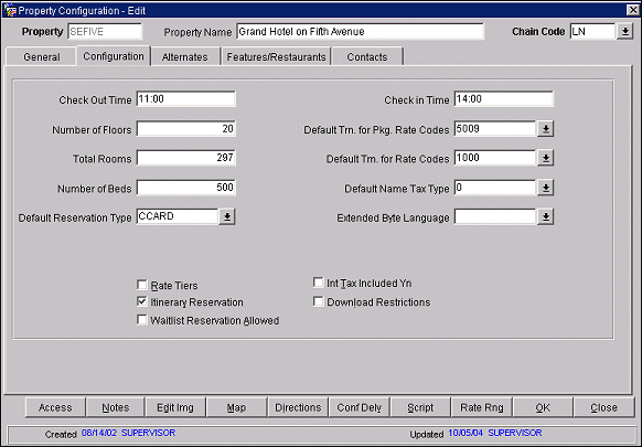 To access this tab, select System Configuration>Property>Property Details to display the Property Selection screen. If you want to edit an existing property, highlight the property on the grid and select the Edit button. Or, select the New button if you want to create a new property and details. The Property Configuration - Edit or New screen appears. Select the Configuration tab.