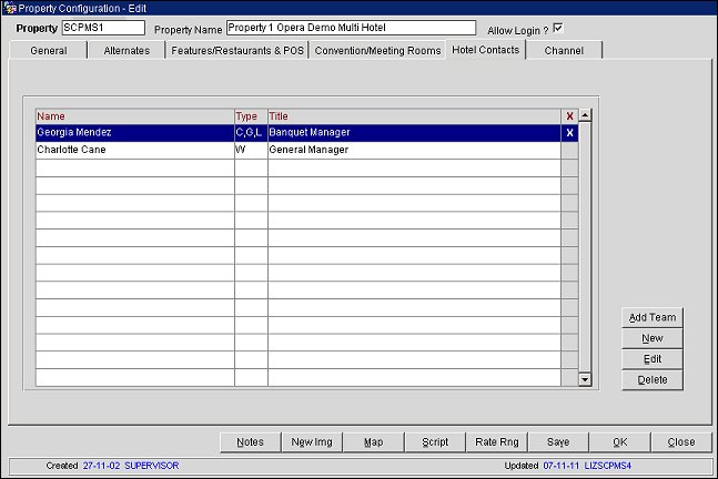 Contacts are assigned from among the contact profiles set up for each property, or for live properties from the configured employee records. Select New or Edit from the Property Configuration Hotel Contacts tab. The Contact Information - New/Edit screen displays. Select a Contact Name and a Contact Type from the LOV that displays when the down arrow button is selected. Once the Contact Owner is selected, enter the information in the subsequent fields (described in section Fields, below) as required.