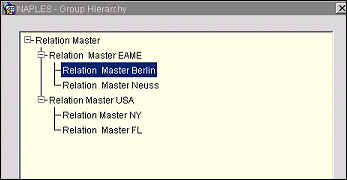 When creating a new group, select New from the Groups screen. In our example, select the Group Type (Company), the Group Name which you are adding to the tree (Relation Master Neuss) and the LOV for Parent Group (the name is the Group Name initially created, however, once applying the OK button the user will be able to actually select the Parent Group Name from the Tree.)