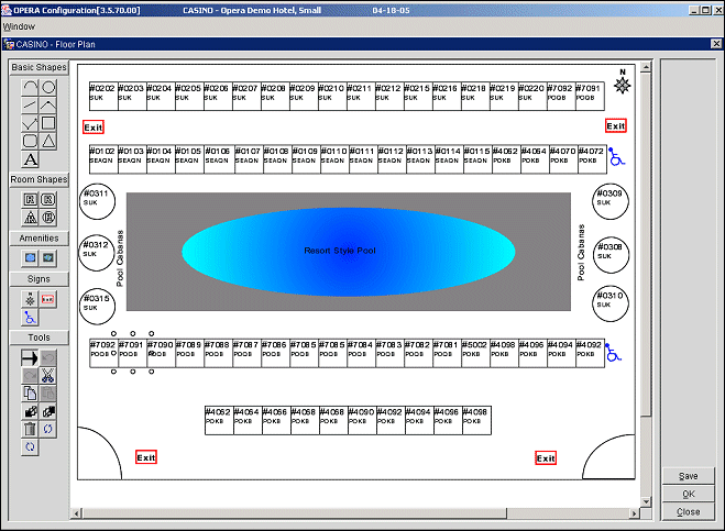 Select Configuration>Reservations>Floor Plans to design the floor plans that are available from the [Shift+F5] Quick Key and from Reservations>Floor Plan menu bar option. (See Floor Plan for details.)
