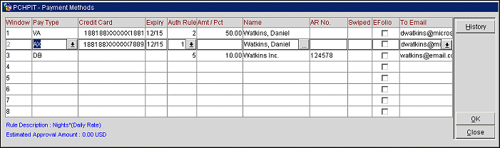 Note: Direct Bill authorization at time of new reservation (i.e. authorization for zero amount) will not display within the History button. History will however display records of direct bill authorizations at check in and checkout.