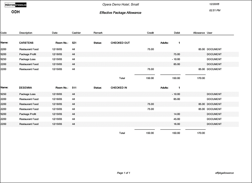 The Effective Allowance Report provides a summarized list of all packages that are in use for the current business date. It provides a detailed breakdown of all package charges, including the allowance balance as compared to the actual package debits and credits. The report output does not include any room revenue package postings. Print this report to obtain a list of internal department charge-back totals.