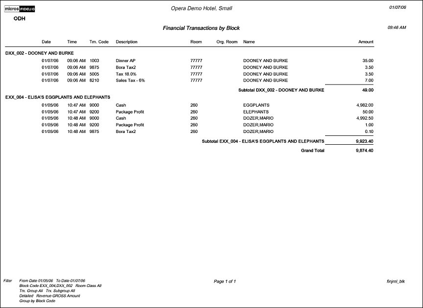 The report selects from financial_transactions. To find out whether a transaction belongs to a block it is joined with reservation_daily_elements, reservation_daily_element_name and reservation_name. Furthermore we join with allotment_header and depending on the filter we may also join trx$_codes.