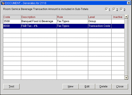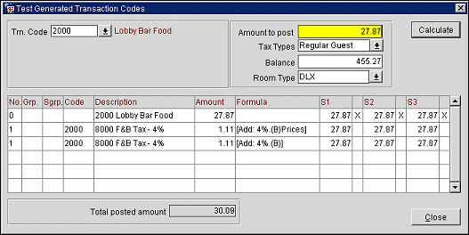 Select Test from the Generates screen to test your current generate setup. The Test Generated Transaction Codes screen appears. This screen allows you to "post" a hypothetical charge to the transaction code to which the generates apply, along with any other pertinent information (such as a tax type, balance, and room type), and see the generates that result from the configuration.