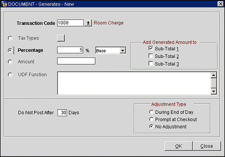 The Generates feature automatically calculates additional charges such as taxes that are added to a guest's bill when a particular transaction code is selected for a posting. For example, a room charge might always generate a room tax charge. The room tax charge can be set up as a percentage of the room charge; as a specific flat amount that is posted each time the room charge is posted; as a user-defined formula; or as a "tax type" which is controlled by several variables that determine if and how the generate will be applied.