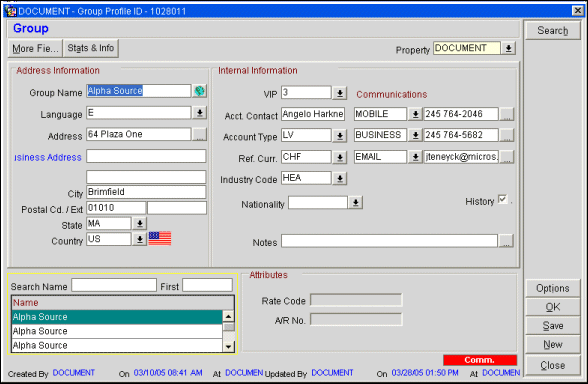 Group profiles are created to handle group events (for example, conventions, meetings, parties, or weddings). A group profile is distinguished from a company profile in that groups usually book for a specific time period and do not have an ongoing (year to year) relationship with the property or chain.