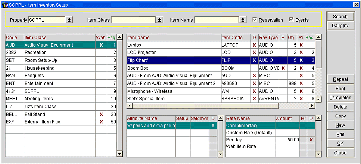 The Item Inventory Setup screen is the starting point for configuring items. Item classes, Item names, attributes, rates, and Item Pools are set up using this screen.
