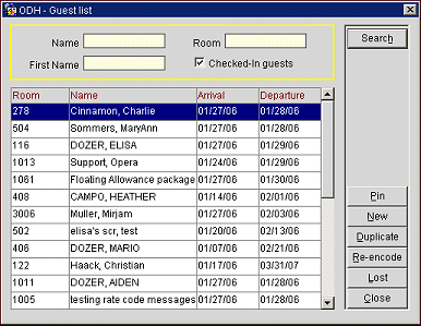 From any point within OPERA, when you select Shift+F8 (or when you select Miscellaneous > Interfaces) the Interface menu appears. If you choose the Keys button from this screen, you may create and duplicate guest room keys. You are first prompted to select the guest for whom you wish to create or replace keys. The Guest List screen appears.