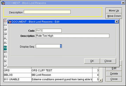 To create a block lost reason code, select System Configuration > Reservations > Business Blocks > Block Lost Reasons. The Booking Lost Reasons screen appears.