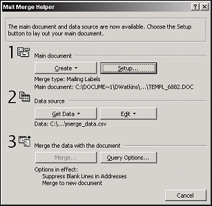 The Mail Merge Helper displays all the information needed to finish converting your query results into the mailing labels that you desire. Once your labels have been set up and contain the information that you want them to display, select the Merge button to merge your information into the mailing labels that have been setup. See Microsoft Word Help for more information on their part in the Mail Merge process.