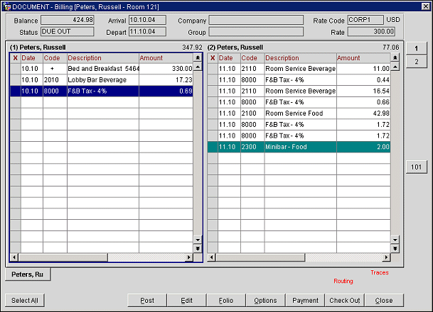 All guests initially begin with one window and you can add up to seven more. The above example shows a guest Billing screen with four windows open, separating room and tax, personal recreation charges, office charges, and banquet food and beverage charges.