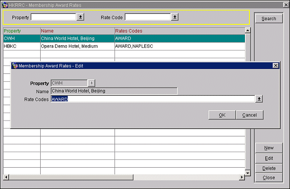 The Membership Award Rates screen appears after the Details button was selected from the Membership Awards screen. This screen shows the rate-based membership awards for the current membership type. Use the search criteria to filter the list by property and/or by rate code.