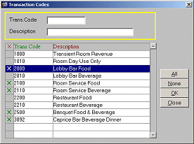 Transaction codes that have the Membership check box selected on the Transaction Code - New/Edit screen display in this list. If you are editing a transaction group, the codes that have already been selected display a check mark in the check mark column. You can either select individual codes by clicking in the check mark column, or you can choose all transaction codes by selecting All or de-select all codes by selecting None. You can search for a particular code by typing its Transaction Code Number or Description in the search fields at the top of the screen.