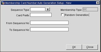 From the Membership Types screen, select the Sequence button to open the Membership Card Number Auto Generation Setup screen.