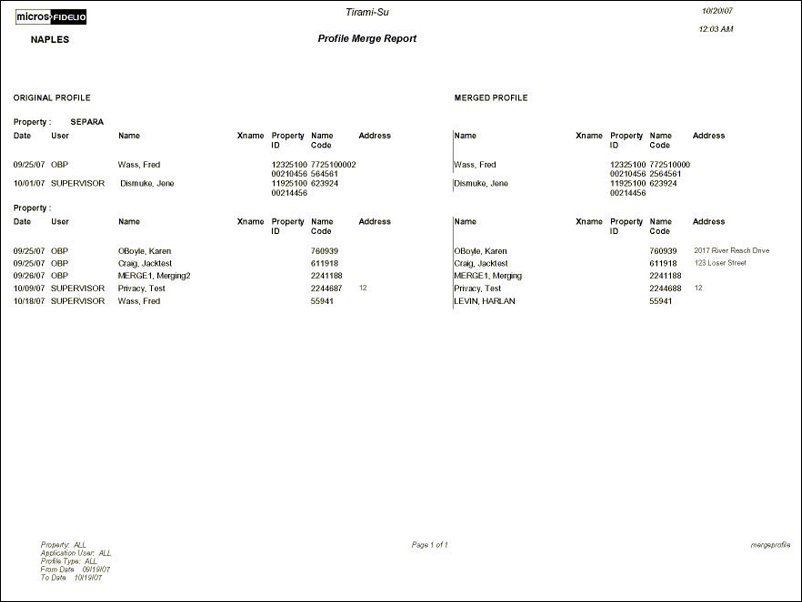 Application User. Select the application user who performed the manual profile merge. The name of the user will appear on the report. Or, select OPERA SYSTEM if you want to see what profiles were merged during Profile Auto Merge by the background processor.