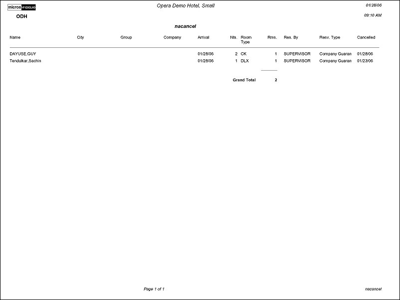 The Cancellation Report is printed as a Night Audit report to show all cancellations that were due to arrive and were canceled only during the Night Audit process.