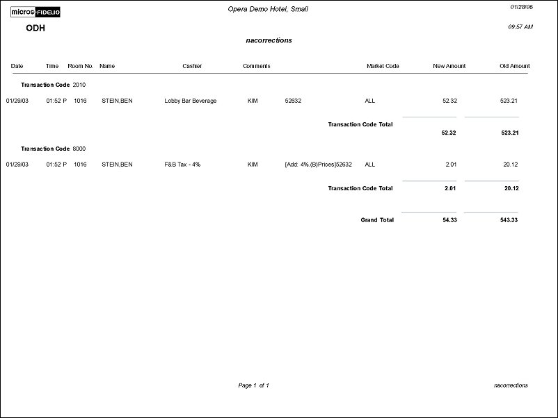 The Posting Corrections Report displays all corrections that have been made to a posting for the current day. This report can be used as a checklist for tracking cashiers' activity. The output will include any corrections posted through the Billing screen, this includes to PM Accounts and Guest Folios.