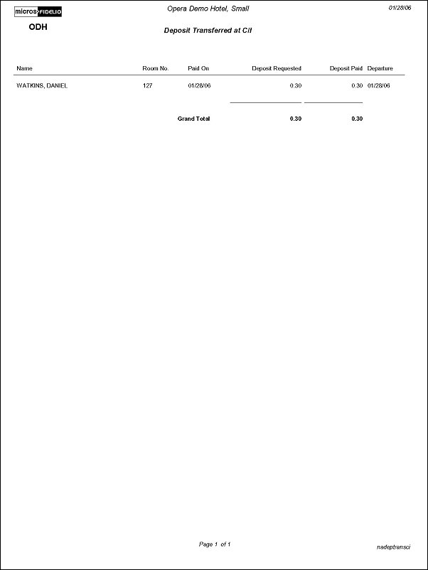 The Deposit Transferred at Check In report will display all reservations which had a deposit posted, and checked in today. The information will include the deposit requested amount as well as the deposit paid amount. If a reservation has multiple deposit requests with amounts paid, a separate line is displayed for each.