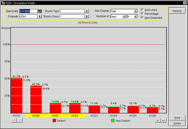 Show Percentage. Select this check box to display the daily room averages in percentage. An unselected Show Percentage check box causes the Occupancy Graph to display the next 31 days as of the entered starting date. For each date the weekday is shown. Use the cursor keys to move to single days, or one week at a time.