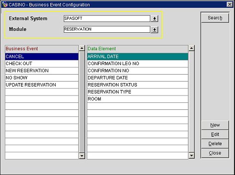 Select the New or Edit button to set up business events and data elements. For SpaSoft, only the Profile and Reservation modules must be configured.