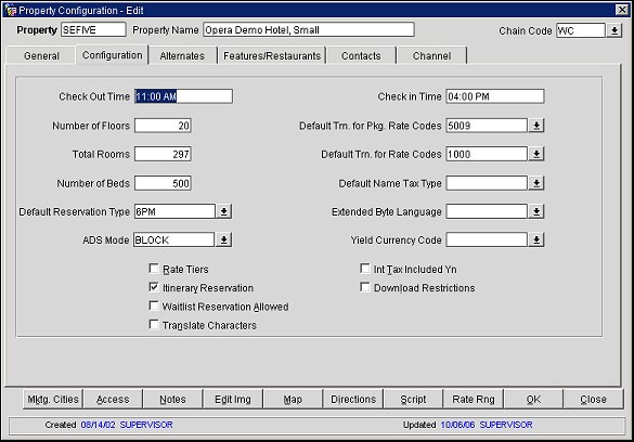For OPERA versions 3.0 up to (but not including) 3.6, you can configure the ADS Mode of an individual property using the Configuration tab on the Property Details screen. The Configuration tab is only available when the OPR <version number> ORS license code is active.