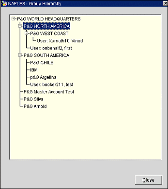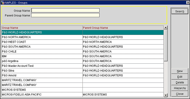 Hierarchy. Displays the Group Hierarchy screen where you can view the group hierarchy and relationship of the highlighted Company or Travel Agent Group and Parent Group.