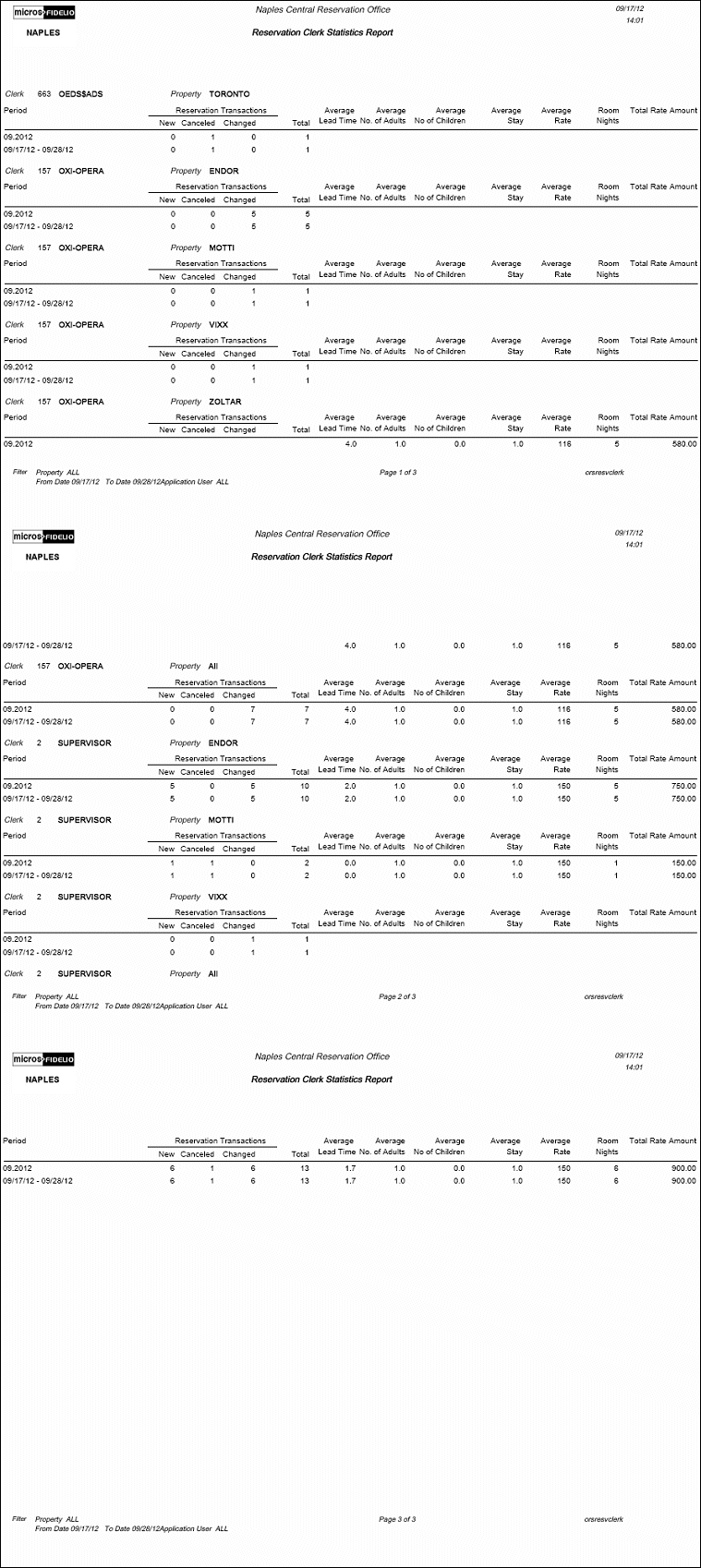 This report will generate all booked reservation activities (NEW, CANCELLED, CHANGED, TOTAL) by application user (clerk/agent) per property. If the application user worked in more than one property during the date range, all properties' reservation activity for that clerk will be totaled in the Property ALL section of the report.