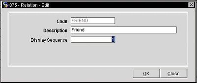 Display Sequence. Enter the sequence number in which the relation code will be displayed in a list of values.