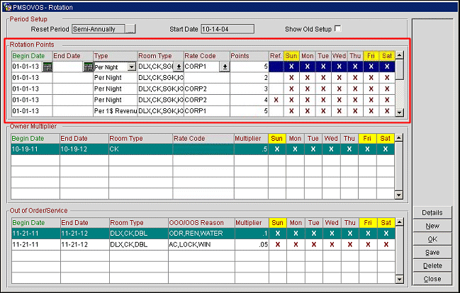 Details. Select this button to display the number of points for each points factor type (Per 1$ Revenue, Per Stay, and Per Night) in effect on any given date, starting on the date shown in the Begin Date field (See Rotation Details below for details).