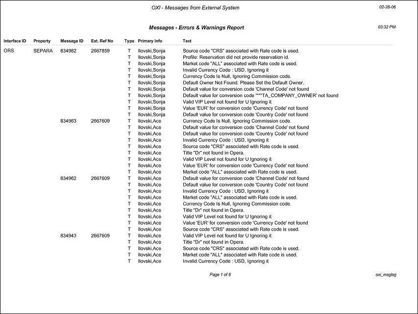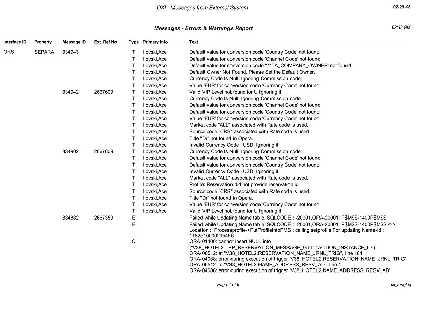 This report captures error messages and warnings for a particular interface/property based on the selection criteria used on the OXI Message Status screen. This report (shown below as Messages from an External System) contains the following data, by column: