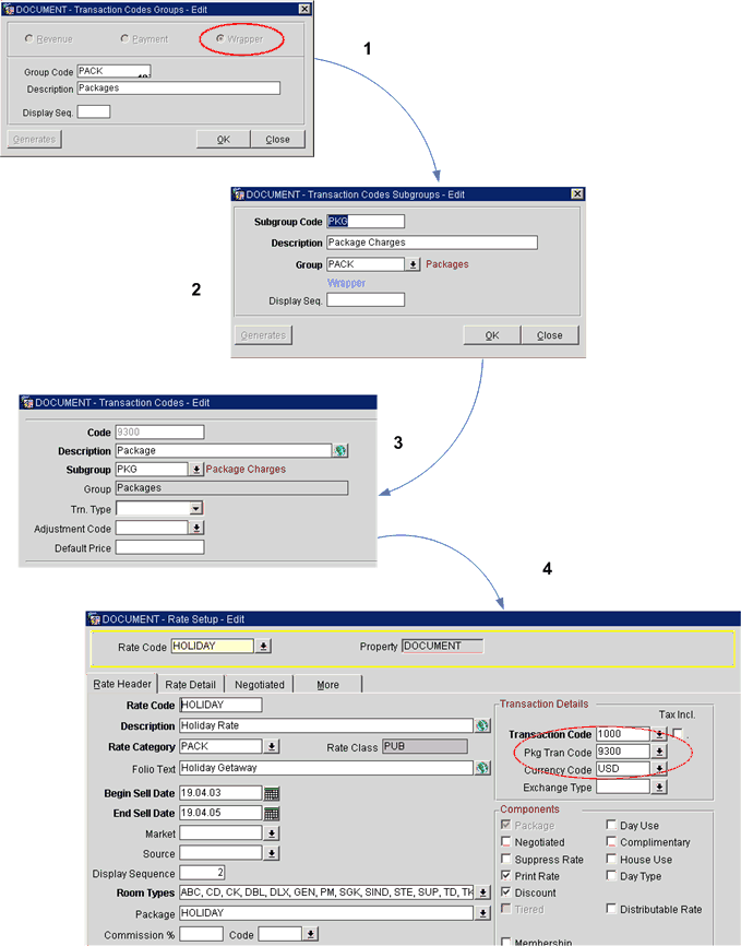 See diagram below. (1) Wrapper codes are set up under Configuration > Cashiering > Codes > Groups. (2) Subgroups are then associated with the wrapper group (Configuration > Cashiering > Codes > Subgroups) and, (3) the subgroups are in turn attached to transaction codes. These transaction codes are known as wrapper transaction codes or package transaction codes. (4) Finally, the wrapper transaction code is associated with a rate code in rate code setup (Rate Management > Rate Classifications > Rate Codes). When charges are attributed to any of the package elements included in that rate, those charges are linked to the wrapper transaction code.