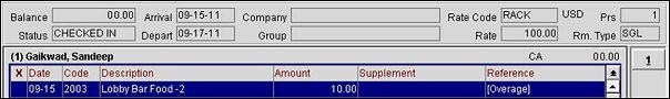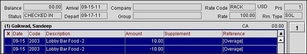 2. Negative $20.00 is posted against trx. code. 2003. OPERA will check for an overage made to transaction code 2003. In this case, the Overage posted to the guest's folio will be posted against.