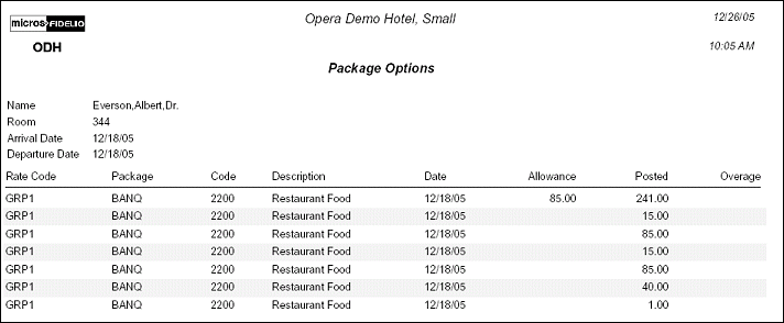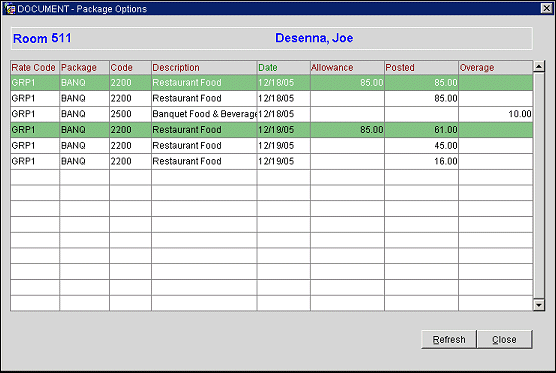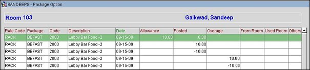 Package elements are identified by their transaction code and description. Entries are sequenced by their date and transaction code. Separate entries tell you the allowance provided by the package; the amount of the allowance consumed by the guest; and, if the guest has consumed an amount in excess of the allowance, the amount of overage. The overage is charged to the guest's bill.