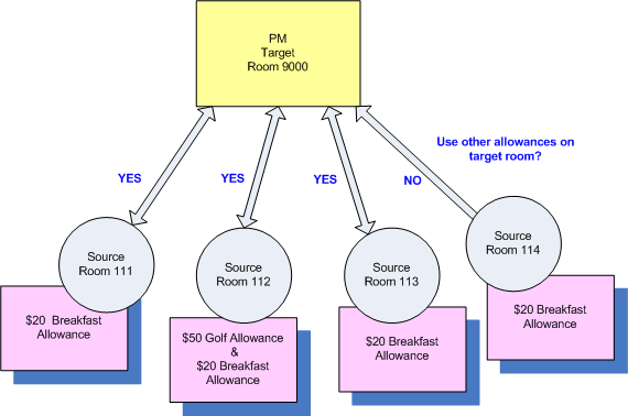 The latter arrangement might be used for a PM room for a business block. The PM room, the target, serves to pool the allowances of the group (the sources) which will then consume the total value of their combined allowances. (See Example 2, below.)