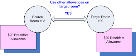 The rooms in a linked allowance relationship are known as the "source" room and the "target" room. The source room makes its allowance available to the target room. Whether or not the source room can draw on the allowance(s) of the target room (and/or the allowances of any other source rooms linked to the target room) depends on your response to a prompt that appears when the link is created: "Use other allowances on target room?" Your answer to this prompt determines whether the link is "one-way" or "two-way":