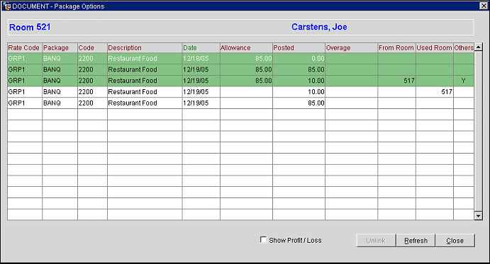 Show Profile/Loss. Select this check box to display package profit and loss information pertaining to the current room. When selected, a Package Profit or Package Loss row appears under each