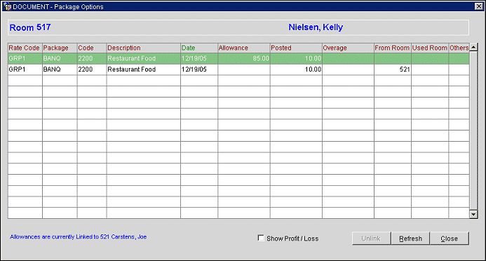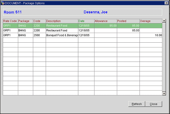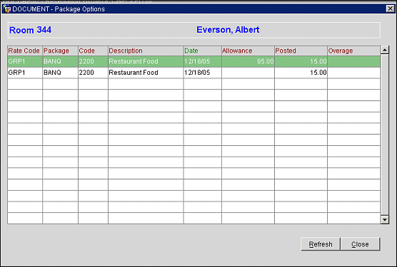 Example 1 - Guest expenditures are less than the package allowance: The package in this example offers an $85 allowance for restaurant purchases that is included in the guest's room rate. During his stay, the guest has consumed $15 of the allowance, shown in the Posted column. This $15 charge will not appear on the guest's Billing screen or on the guest's folio. It is included in the room rate.