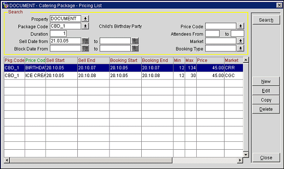 Use the Catering Package - Pricing List screen to set up the pricing for catering packages.