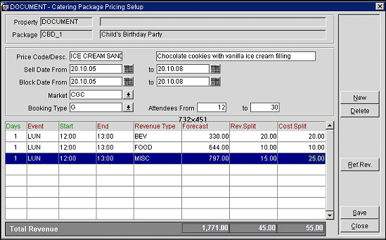The screen automatically displays the food and beverage and item resources (revenue types) already chosen for the package. Enter the following information directly into the grid. Select the Ref Revenue button to refresh revenue figures shown in the lower screen in the Total Revenue line.