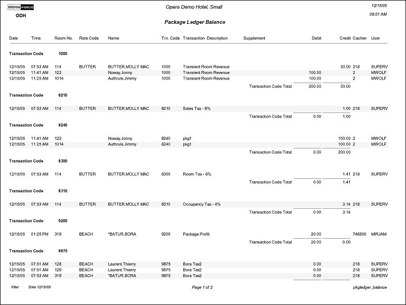 Note: when the Rates>Apartment Style Billing application function is set to Y and when the Cashiering>Only Post Taxes Once for Apartment Style Billing Charges application parameter is set to Y, tax generate amounts configured for the service charge that are part of a ASB Rate, will not be posted on the Package Ledger Balance report.