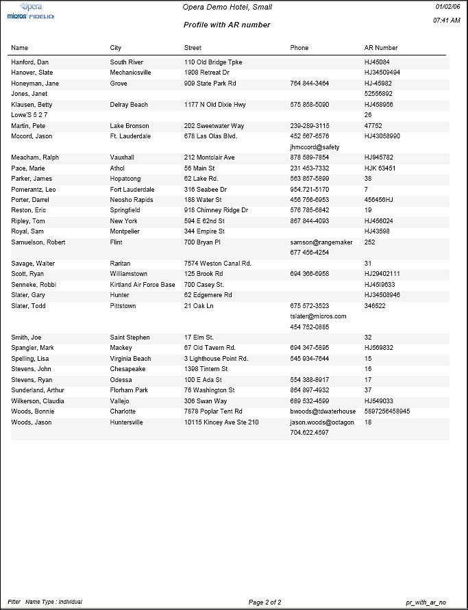 For each profile, the report shows the profile name followed by the primary mailing address (City and Street). The Phone column shows the primary phone-type communication address (such as a mobile phone number, home phone number or business phone number) configured for the profile; if no phone number is configured for the profile, a primary communication address of another type (e.g., FAX, EMAIL, WEBPAGE), as available, will appear in the Phone column. If the profile has multiple communication addresses designated as primary for their type (e.g., FAX, EMAIL, WEBPAGE), these are listed in the Phone column on separate lines, without repeating the profile name, street address, and AR number. The AR Number column shows the AR account number.