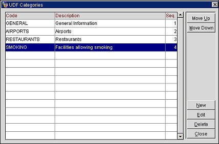 Property User Defined (UDF) Categories are set up to group associated Property User Defined (UDF) Types for use on the ORS Sales Screen. This information appears on the Property Search - UDF tab screen when reservation agents select the UDF tab on the Sales Screen's Properties display (Sales Screen>New>Properties>UDF). The information in the property UDF tab contains information not found in other fields.